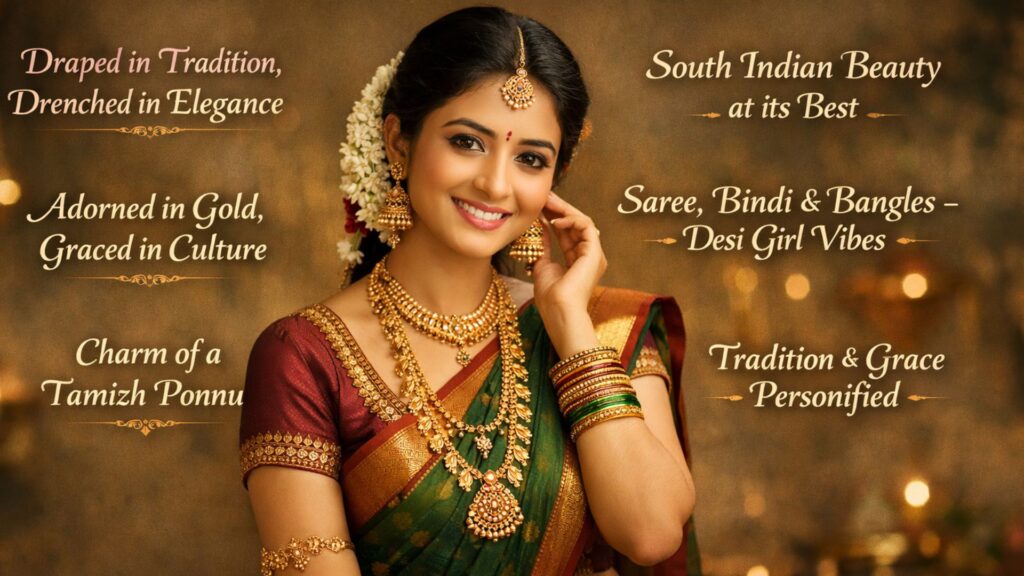 It is defined by sarees, jasmine flowers, gold jewelry, and a graceful, confident presence rooted in tradition.